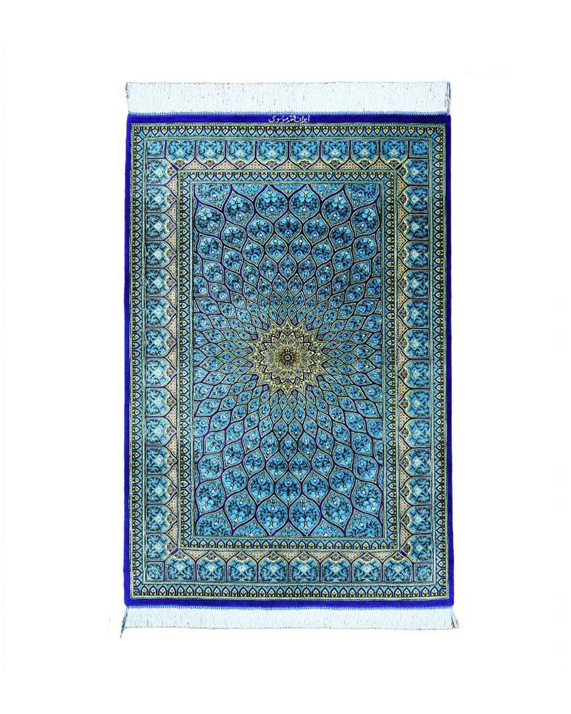 織りがとても細かく1平方センチに81万個以上の結びがある緻密な織りの絨毯がほとんどです。工房名は絨毯の上部の中央部分にペルシャ文字で書かれています。